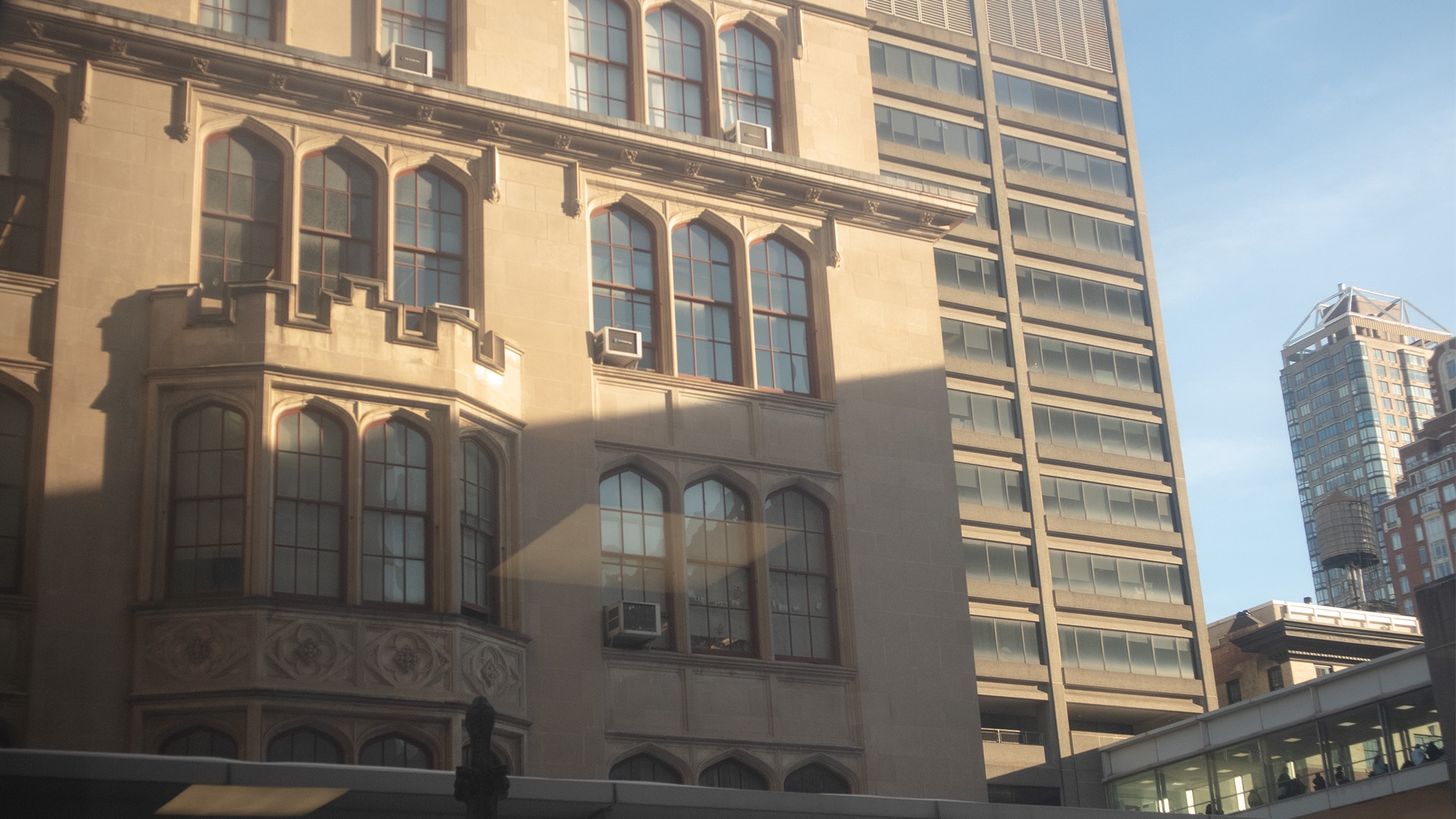 Image A: Luckily my lab class is during the late afternoon, meaning beautiful lines of shadow mark the Hunter buildings and really show off their detail. I liked this composition because of the layers of detailed lines between the North building, the East building, and the diagonal sky bridge at the bottom. As for the colors, I was inspired by the rolls of expired film that I've had developed, where the colors are returned softer and more washed out than I would expect new film to be. The colors in this photo make me long for summer and feeling the sun on my face outside.