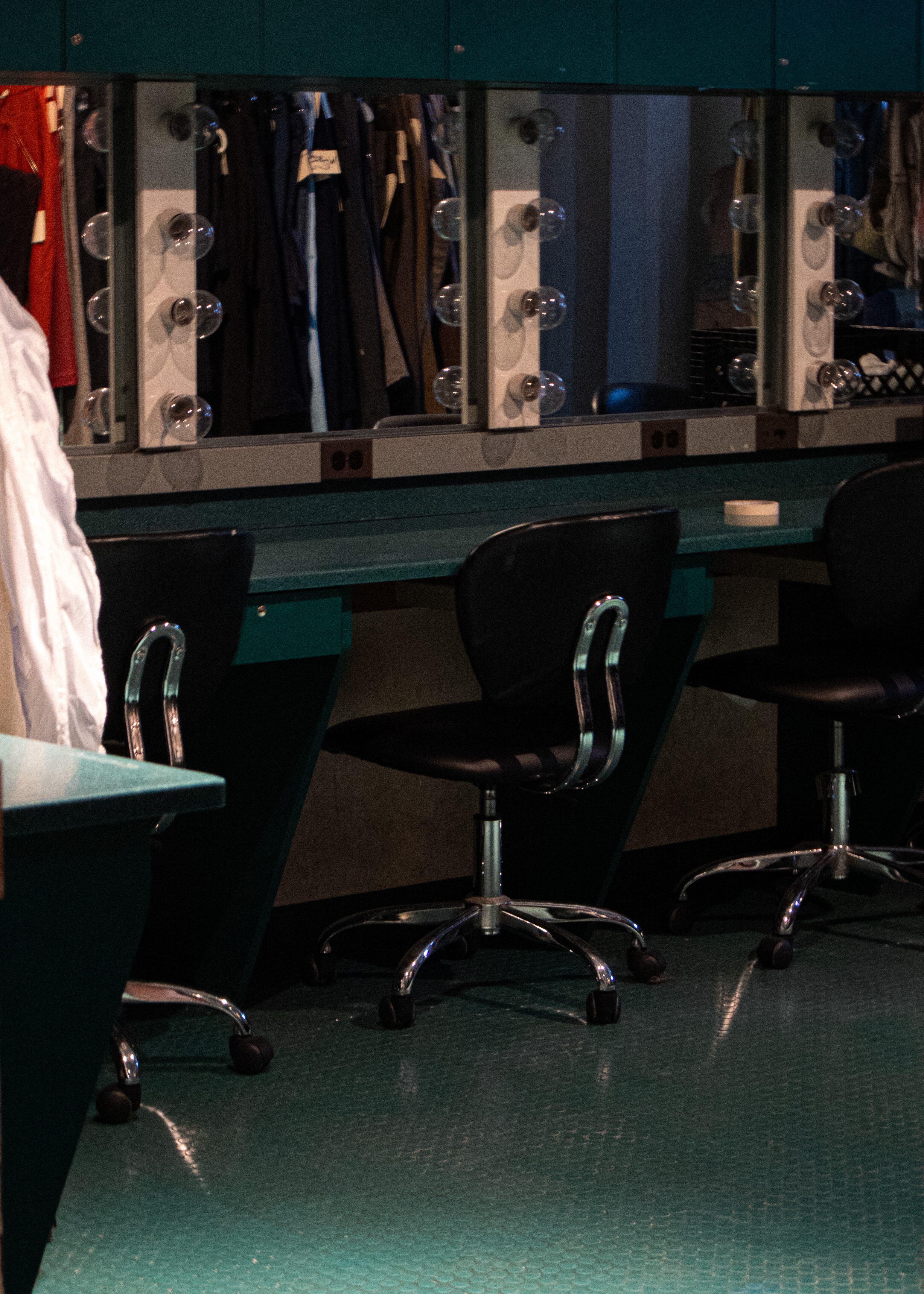 Image B: While exploring the school for this assignment, I visited hallways I'd never been before to see what I could find. This was one of the theater department rooms. I loved the deep green color of the cabinets and the chrome on the chair shining from the dark. It's not as in focus as I'd like so I masked that slightly by adding texture and grain to the image. If I could do the assignment again, I would use this image for the first crop, as I actually do not like this crop (5"x7") compared to the original crop on the image, which is attached to the right. Something about the voyeuristic framing with the door and more view of the cabinets tells more of a story to me.